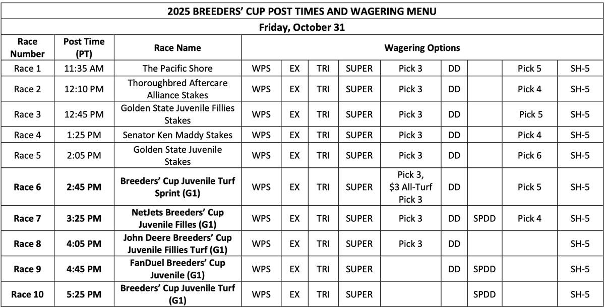 The World Championships begin Friday with a 10-race card anchored by the Breeders’ Cup Juvenile Turf. First post is 11:35 a.m. PT / 2:35 p.m. ET, with five undercard races preceding the first Championships race – the Breeders’ Cup Juvenile Turf Sprint, Race 6, with a post time of 2:45 p.m. PT / 5:45 p.m. ET. The Breeders’ Cup Juvenile Turf, Race 10, will wrap the day with a post time of 5:25 p.m. PT / 8:25 p.m. ET.