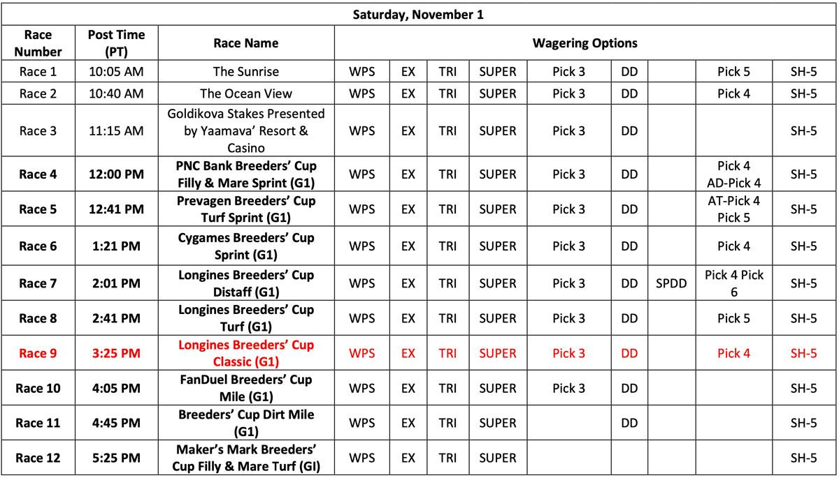 The Breeders’ Cup will also offer the Breeders’ Cup All-Dirt Pick 4 on Saturday, which is a $.50 minimum wager. The four races, in order, are: