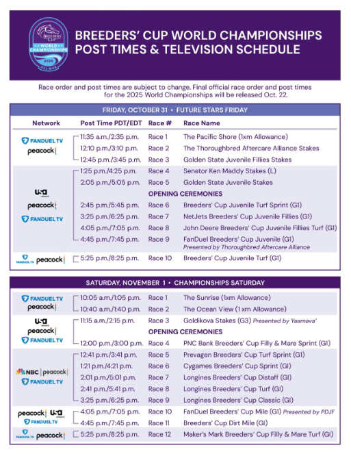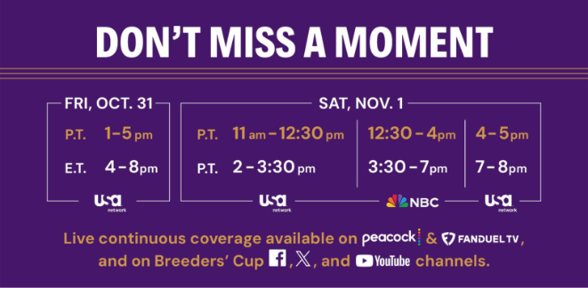 As part of an expanded live distribution strategy, the “Players’ Show” will also stream across Breeders’ Cup’s official YouTube, Facebook, and X channels, providing real-time access for digital-first and global audiences. NBC’s live coverage of all 14 Championship races will also be streamed live on Peacock.