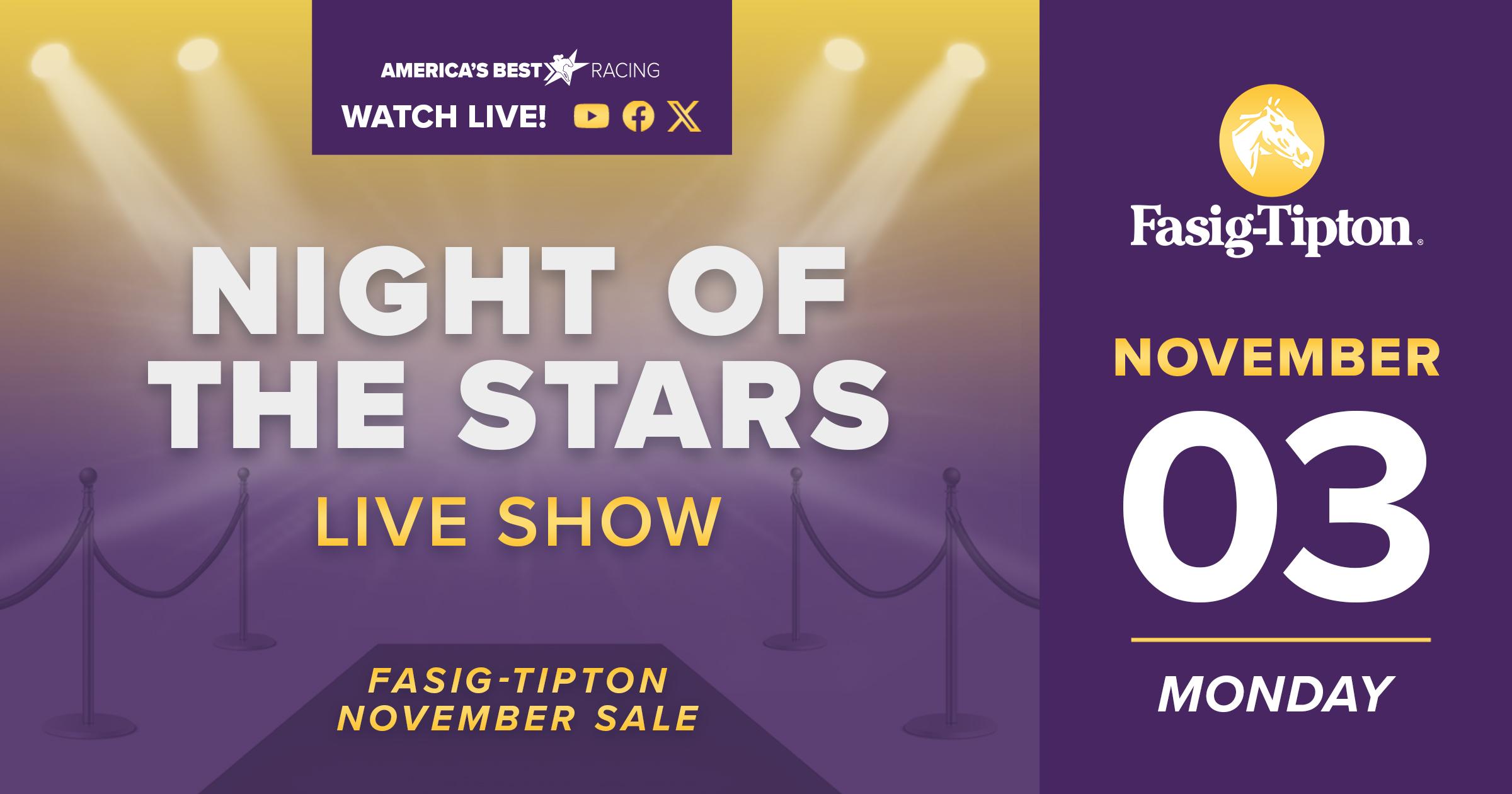 After a successful livestream last summer at Fasig-Tipton’s Saratoga select yearling sale, America’s Best Racing is back with another action-packed show Monday. ABR presents “Night of the Stars! Live Show” on-site from Fasig-Tipton’s auction house in Lexington, Ky., where many talented horses including broodmare prospects straight from the Breeders’ Cup will go through the ring.