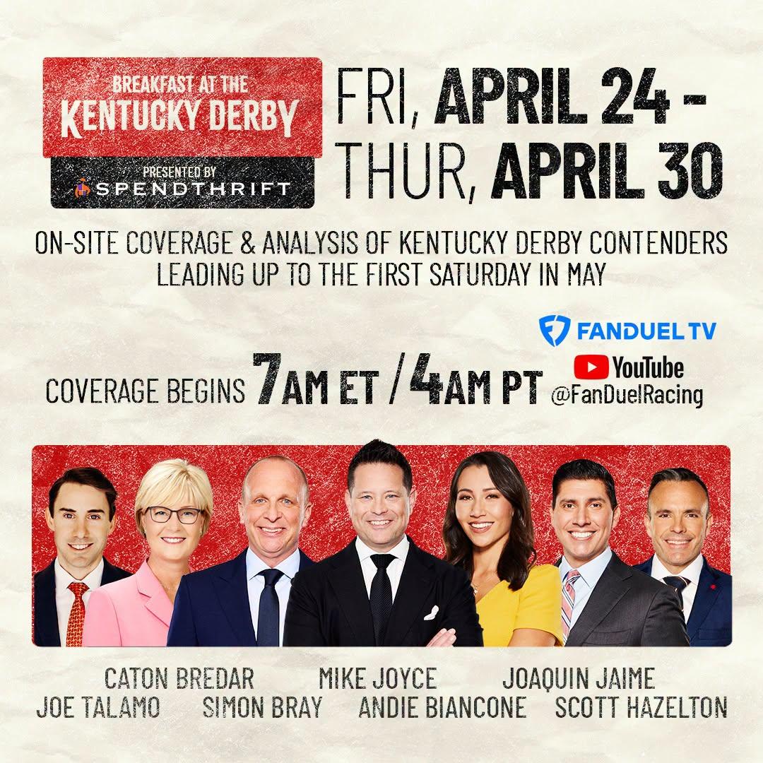 FanDuel TV begins its “Breakfast at the Kentucky Derby” on-site coverage Friday running through April 30, starting at 7 a.m. ET and also focusing on the exclusive Derby training time. The program features reporting and analysis from FanDuel’s Caton Bredar, Joe Talamo, Simon Bray, Mike Joyce, Andie Biancone, Joaquin Jaime, and Scott Hazelton. It can be viewed on FanDuel TV and on FanDuel Racing’s YouTube channel.