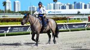 There is a new rock star emerging at Gulfstream Park this year who has everyone buzzing about his size, demeanor, and stature. And he is not a Thoroughbred! Master is a solid, 16.3 hands, draft cross, blue roan gelding owned by Aidan Butler, Chief Executive Officer, 1/ST Racing & Gaming. FanDuel TV reporter/analyst (and assistant trainer) Andie Biancone’s laughter is infectious as she describes the first time she saw Master on the track.