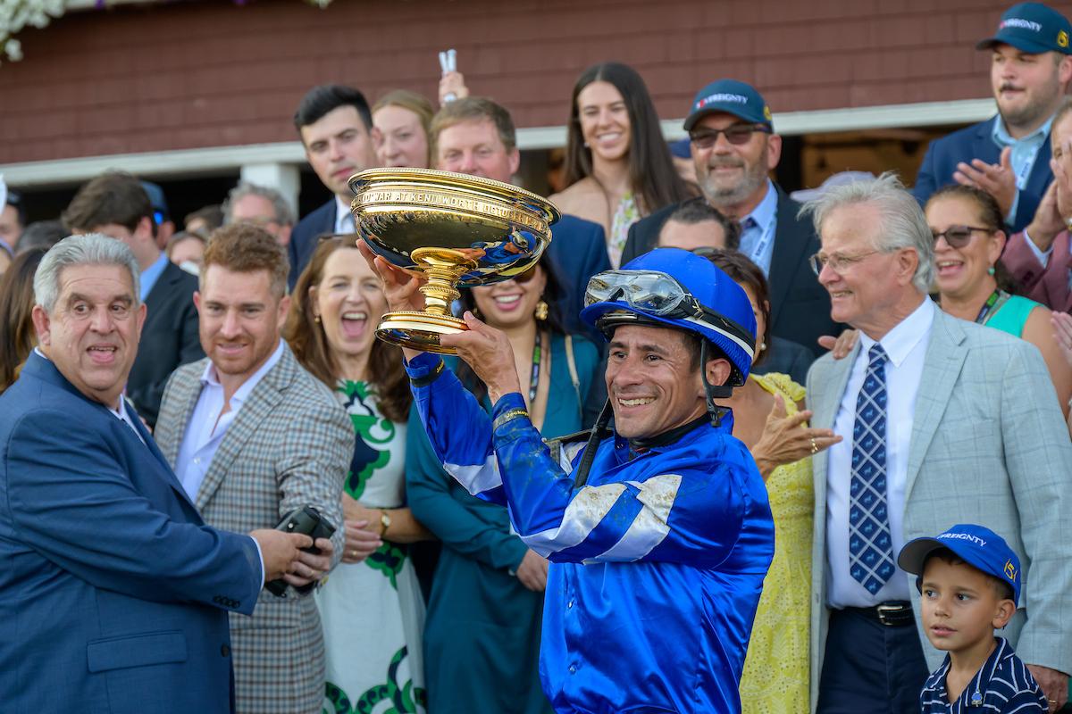 Mott and Alvarado celebrate Travers win. (Eclipse Sportswire/Carlos J. Calo)