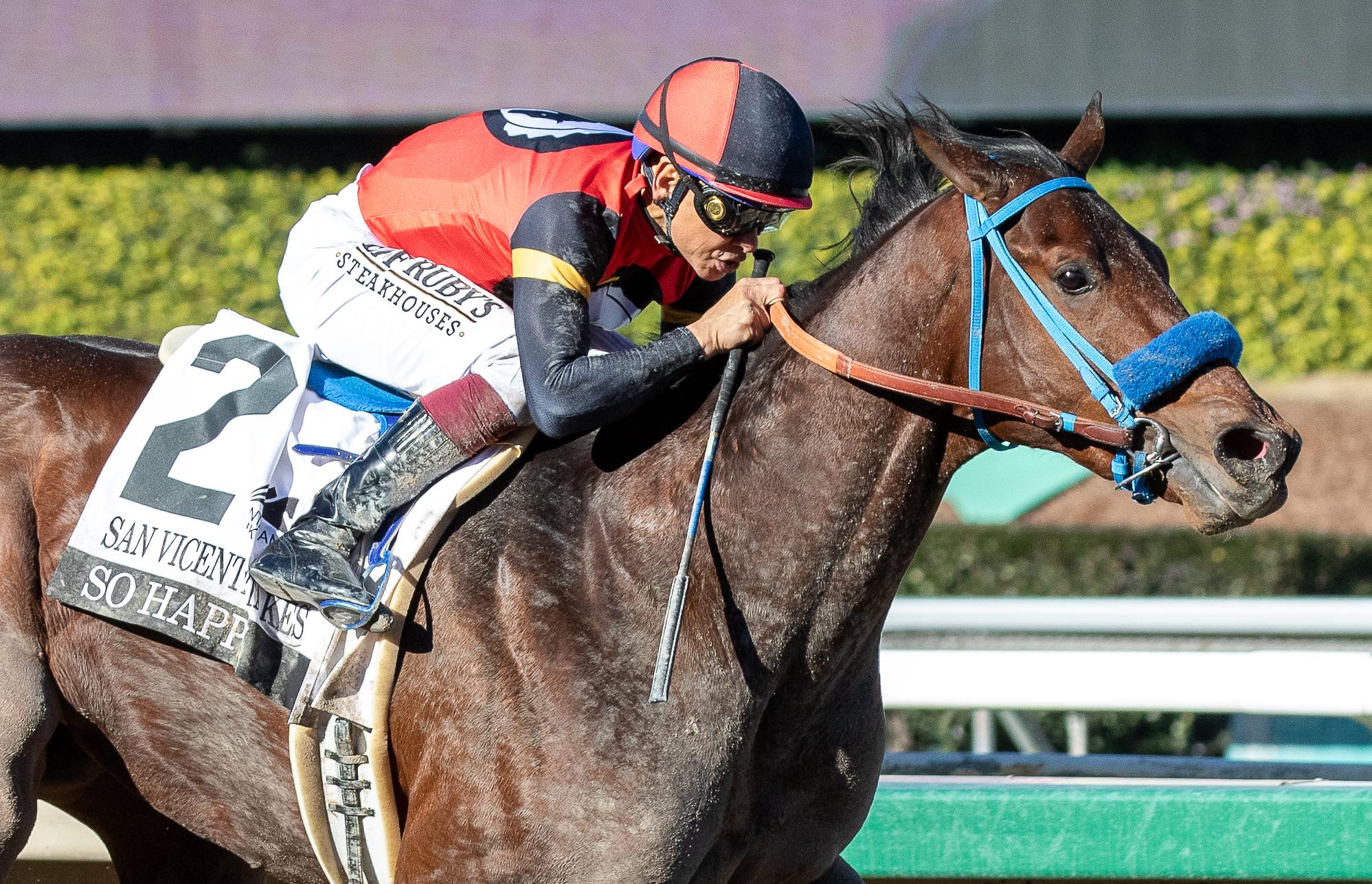 It’s reasonable to be skeptical about So Happy’s chances to continue to excel as the races get longer on the Kentucky Derby trail. His sire, Runhappy, is a champion sprinter and he has yet to compete in a race longer than seven-eighths of a mile. But his two starts to date have been really good. He defeated nine horses in a three-quarter-length debut win Nov. 22 at Del Mar and then rallied from last of five — not noted in the chart but he was last briefly on the backstretch — to win the Grade 2 San Vicente Stakes by two lengths Jan. 10 at Santa Anita Park. Trained by Mark Glatt, So Happy delivered a professional effort under Hall of Fame jockey Mike Smith in his second start. He responded when asked to accelerate, switched leads on cue at the top of the stretch, and had plenty of fuel in reserve to put away odds-on favorite Buetane in the stretch. He earned a 106 Equibase Speed Figure, 96 Beyer Speed Figure and a 9 (lower is better) on the Ragozin Sheets for the San Vicente. So Happy’s dam (mother), So Cunning, is by 2010 Breeders’ Cup Classic winner Blame and won a pair of sprints impressively before an unplaced finish at one mile in her final race. So Happy’s grandam (maternal grandmother), So Glitzy, won three starts at distances from a mile to 1 1/8 miles and was Grade 3-placed at 1 1/8 miles. So Happy might be up to the distance challenge.
