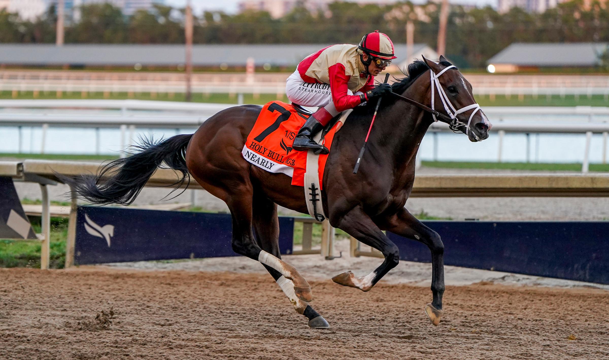 After Nearly reeled off easy half-mile breezes in February following his victory in the Jan. 31 Holy Bull Stakes at Gulfstream Park, two-time Derby-winning trainer Todd Pletcher asked him for more March 6 in preparation for the March 28 Curlin Florida Derby with a five-furlong in-company work at Palm Beach Downs in 1:00.60. As nice as his Holy Bull triumph was – winning by 5 ¾ lengths in a time of 1:44.52 – his final sixteenth was sluggish, timed in :07.10, which seems in part a product of him pushing a quick pace. The 1 1/8-mile distance of the Florida Derby should provide a barometer for his prospects at 1 ¼ miles in the Kentucky Derby.