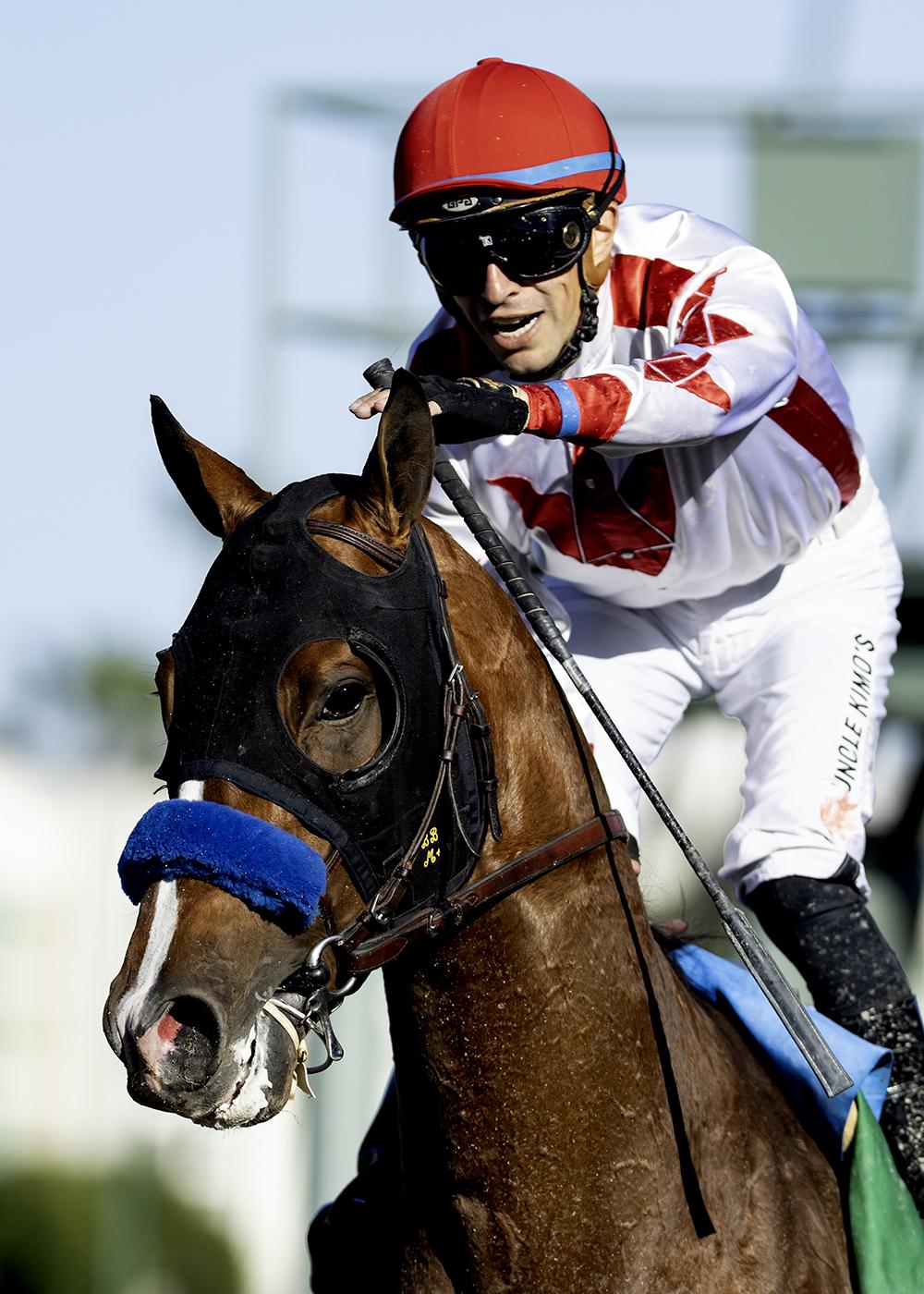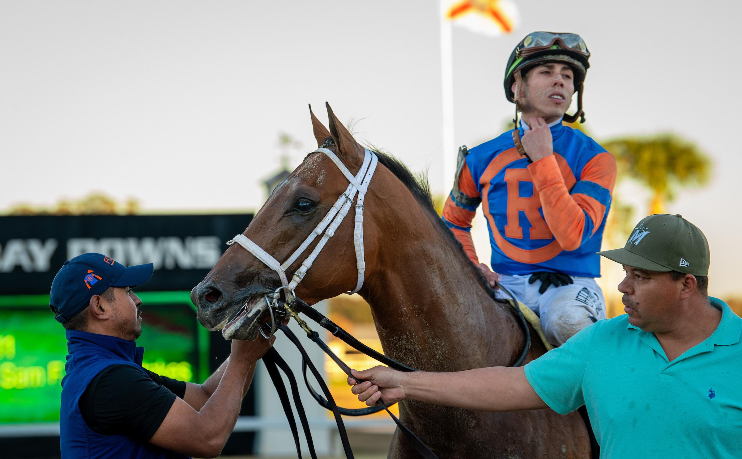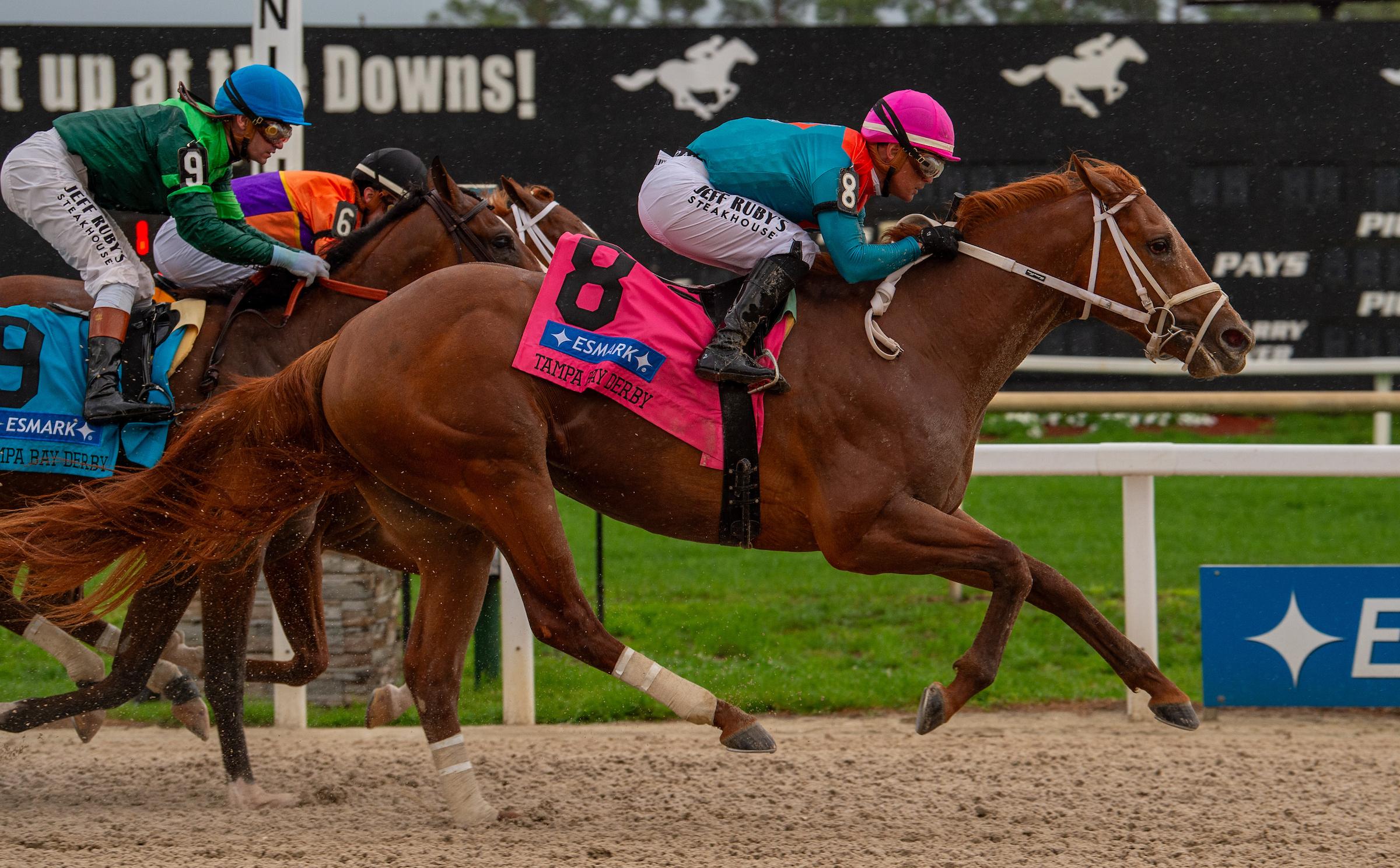 Like Canaletto, he appeared to be in trouble early in the ESMARK Tampa Bay Derby when hung wide into the first turn, falling all the way back to last. He then lost ground on the second turn with a further wide advance, but he ran down the leaders anyway, finishing strongest. His time of 1:43.23 for 1 1/16 miles was on the slow side relative to 4-year-old Disruptor’s clocking in winning the Michelob Ultra Challenger Stakes 3 ½ hours earlier on the card, though perhaps a rainstorm before the Tampa Bay Derby slowed the speed of the track surface even though it was still rated fast.