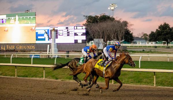Gun Runner Stakes winner Chip Honcho, who pricked his ears while racing unchallenged on the lead through splits of :23.68, :47.49, and 1:11.53, settled kindly up front with the removal of blinkers under jockey Luis Saez. He ran the best race of his life but it wasn't enough. Paladin, bidding outside the leader under jockey Tyler Gaffalione, doggedly pursued Chip Honcho, inching past him in the final sixteenth of a mile nearing the finish of the long Fair Grounds stretch.